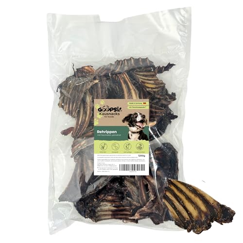 - √ LANGES KAUVERGNÜGEN: GOOPSI Rippchen für Hunde sind ein harter Kauartikel. Sie bestehen aus Rippenbogen vom Reh und Fleischresten. In handliche Stücke vorgeschnitten sind sie ein idealer Kausnack für mittelgroße und große Hunde. Lasse deinen Hund nie unbeaufsichtigt, wenn du ihm Kauartikel gibst. Knochen können splittern.